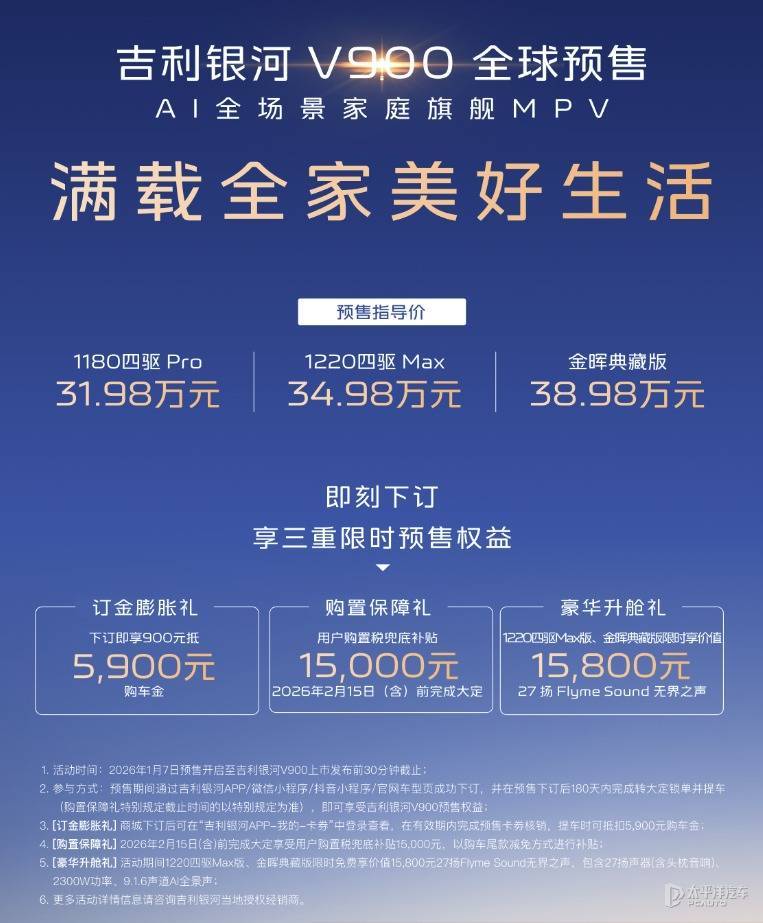吉利银河V900预售价31.98万元吉利银河旗下中大型MPV银河V900正式开启预售,共推出3款车型,预售区间为31.98-38.98万元。新车定位为一款中大型MPV,基于GEA Evo全球智能新能源旗舰架构打造,首次搭载吉利超级AI增程技术,主打三排平等空间体验与智能化出行场景。