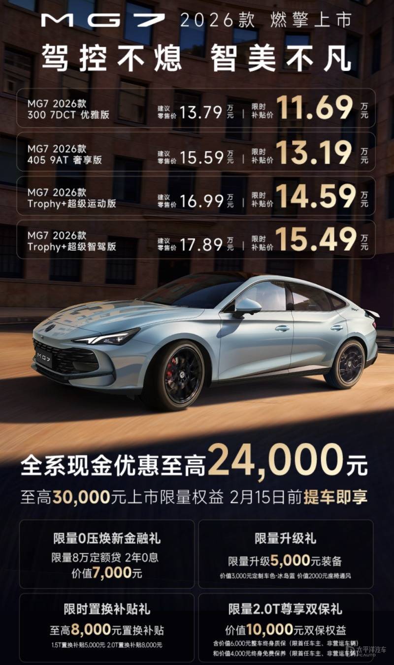 26款MG7搭载NGP高阶辅助驾驶系统26款MG7上市,四款车型指导价区间为13.79-17.89万元,限时补贴价为11.69-15.49万元。作为改款车型,新款MG7全系标配三段式尾翼、19英寸轮毂、9扬声器BOSE音响、8155智能座舱、前排座椅加热等豪华配置,并搭载NGP高阶辅助驾驶系统,动力上提供1.5T和2.0T两款发动机可选,配有E-LSD电子限滑差速器和mCDC智能可调电控悬架。