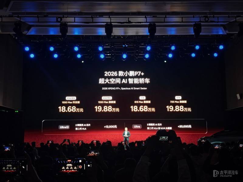 小鹏P7售18.68万元,新增增程动力2026款小鹏P7+正式上市,推出4款车型,增程版两款,纯电版两款,售价区间为18.68-19.88万元。新车搭载小鹏第二代VLA(2026年第一季度推送)和图灵AI芯片,算力可达2250TOPS。增程版小鹏P7+的纯电续航里程为430公里,综合续航里程可达1550公里。