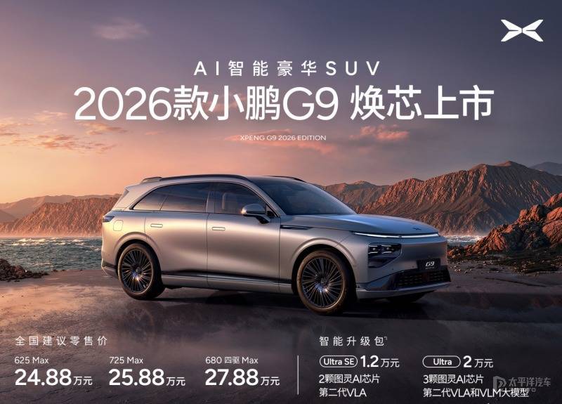 小鹏G6/小鹏G9换装AI图灵芯片新款小鹏G9/G6正式上市,新款小鹏G9推出3款车型,售价区间为24.88-27.88万元。新款小鹏G6推出2款车型,售价区间为17.68-18.68万元。