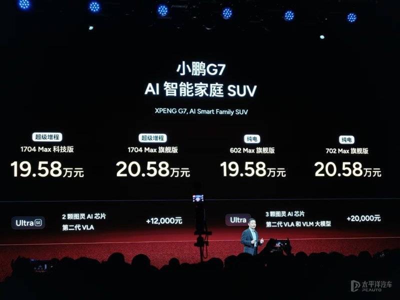 小鹏G7增程系统加持新款小鹏G7推出四款车型,增程版两款,纯电版两款,售价区间为19.58-20.58万元。新车搭载小鹏第二代VLA(2026年第一季度推送)和图灵AI芯片,算力可达2250TOPS。小鹏G7 增程版的纯电续航里程为430公里,综合续航里程可达1704公里。